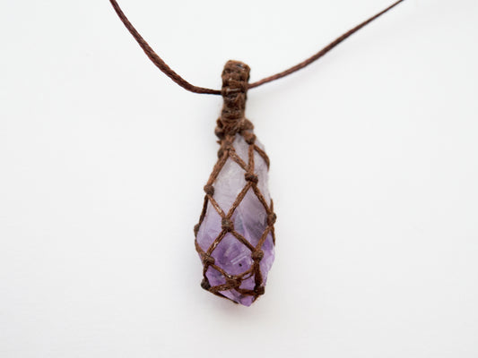Amethyst Point Crystal Pendant / Macrame Wrap Chord Necklace / Knotted in Brown Cotton on Adjustable Length Chord