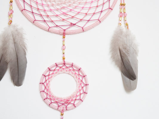 • 6" Baby Pink Rose Quartz Crystal Double Dreamcatcher Wall Hanging