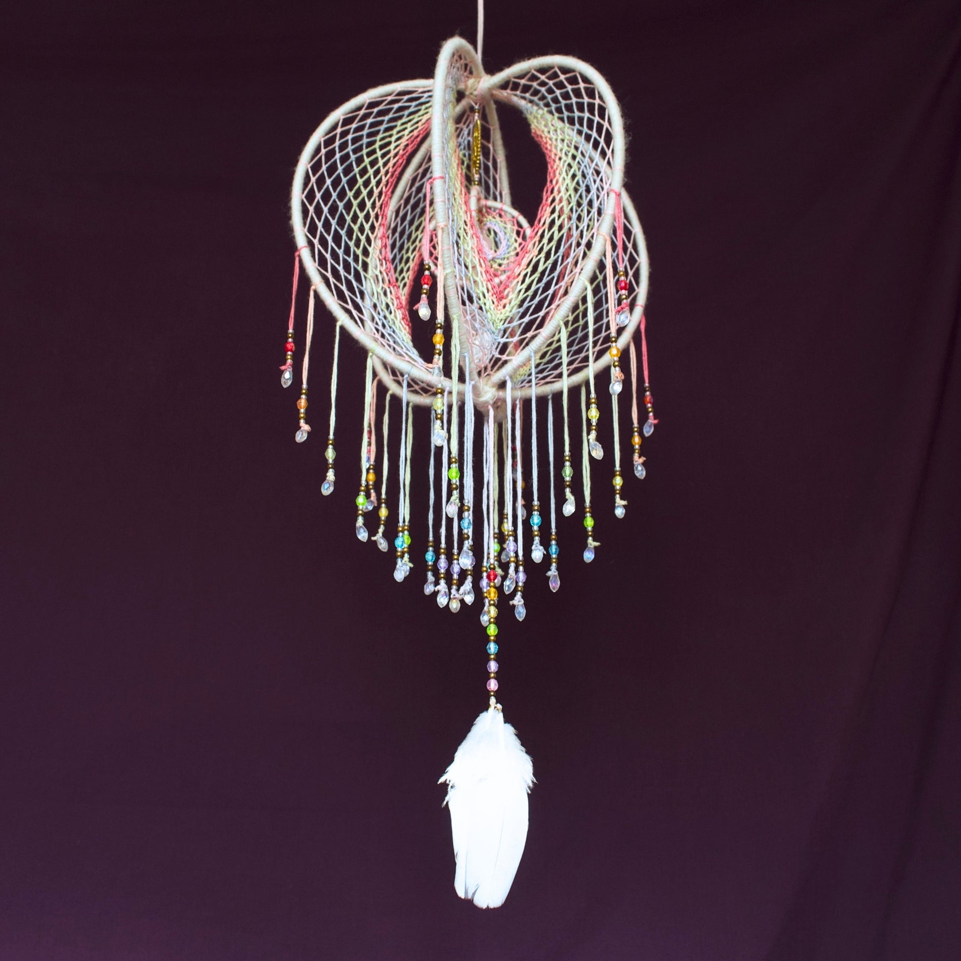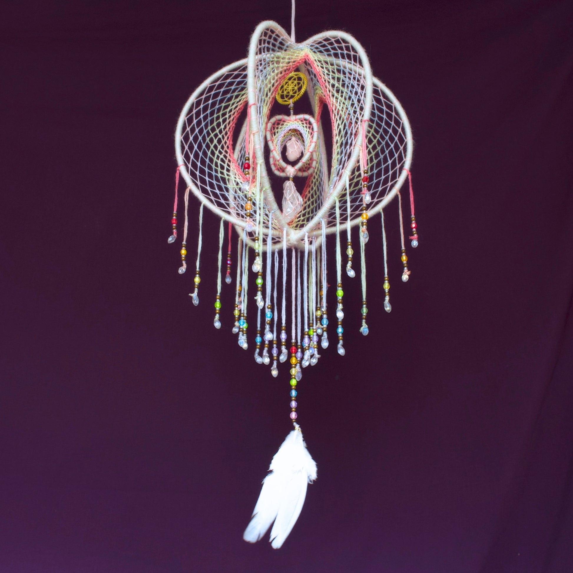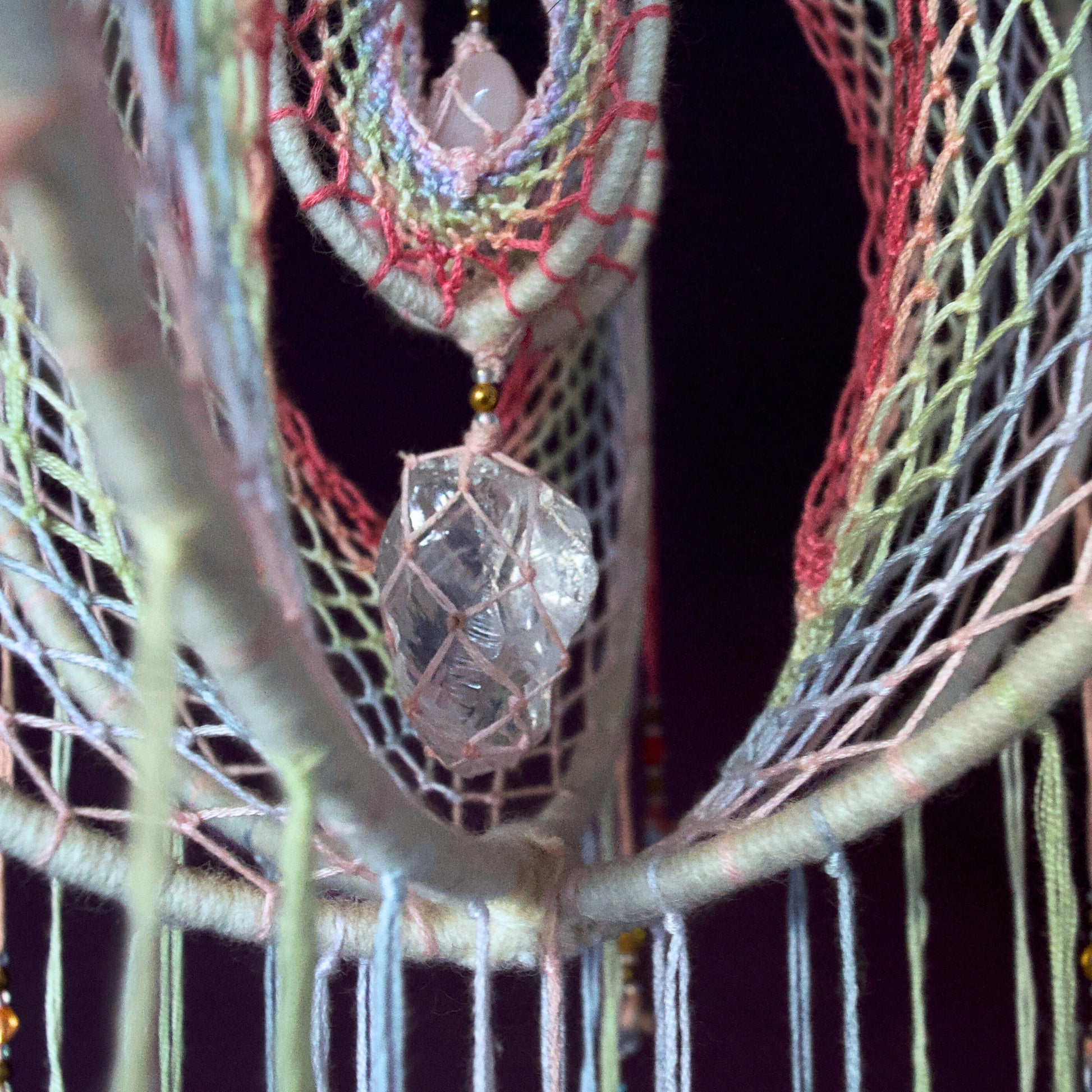 Foraged feathers, acrylic yarn, metal hoops, muted pastel cotton threads, gold and iridescent beads, Rose Quartz, Clear Quartz, large seed of life charm, hanging string.